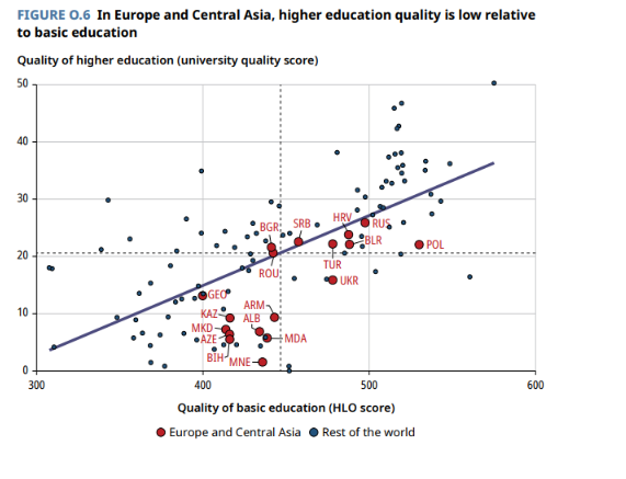 Siç shihet në grafikun e mëposhtëm, Shqipëria u kualifikua në nivelin më të ulët të cilësisë në Arsimin e lartë si në raport me Rajonin ECA, ashtu edhe vendet e tjera të botës. Banka vë në dukje se arsimit nxit talentet, të cilat më pasi garantojnë prosperitetin.