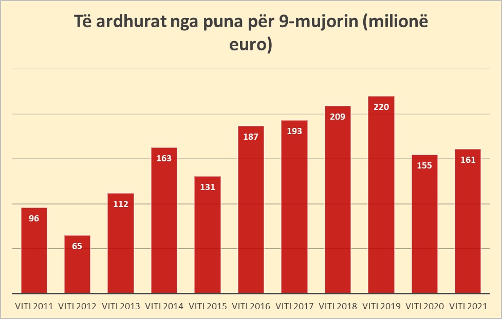 Por, viti i pandemisë solli një rënie të fortë të të ardhurave në këtë zë. Megjithëse këtë vit të ardhurat nga puna i janë kthyer rritjes, shifrat janë ende larg niveleve të para pandemisë. Nëse përjashtojmë vitin e kaluar, shifra e 9-mujorit të këtij viti prej 162 milionë eurosh është më e ulëta që prej vitit 2015.