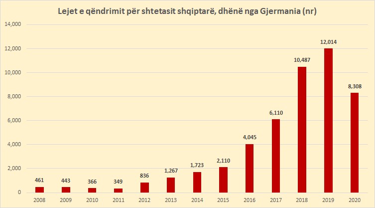 Të dhënat e Eurostat tregojnë se lejet e qëndrimit që Gjermania ka dhënë ndaj shtetasve shqiptarë janë rritur ndjeshëm duke filluar nga viti 2018. Në atë vit mbi 10 mijë shtetas shqiptarë u pajisën me leje për të jetuar e punuar në ekonominë më të madhe të Europës. Në 2019-n, numri i tyre i kaloi 12 mijë. Në 2020-n, ndonëse në pandemi dhe kufizime të forta në lëvizje, u dhanë rreth 8,300 leje qëndrimi.