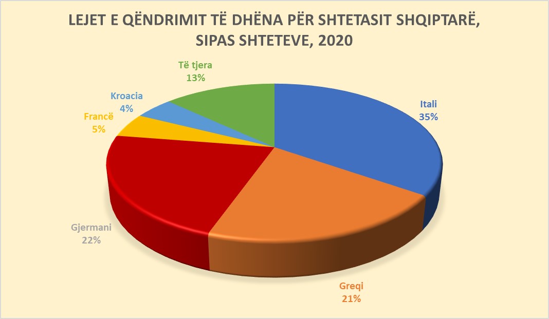 Në total, që nga viti 2008, kur INSTAT raporton të dhënat, Gjermania ka dhënë gjithsej  48.5 mijë lekë, por 64% e tyre u dhanë vetëm në periudhën 2018-2020. Në vitin 2020, Gjermania për herë të parë u rendit si shteti i dytë për lejet e dhëna për shtetasit shqiptarë, me 22% të totalit, pas Italisë me 34% dhe duke lënë pas Greqinë, me 20.6%. Historikisht Italia dhe Greqia kanë qenë dy shtetet më mikpritëse për shqiptarët që duan të jetojnë e punojnë jashtë.