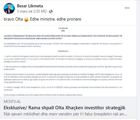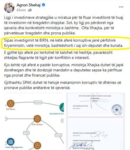 Deputeti Agron Shehaj dhe njëkohësisht anëtari i Komisionit të Rithemelimit të Partisë Demokratike, ka reaguar lidhur me vendimin e qeverisë shqiptare për t’i dhënë statusin e investitorit strategjik në bregdetin e Himarës, ministres për punët e jashtme, Olta Xhaçka. Një zbulim i bërë nga “MCN TV” para një jave.