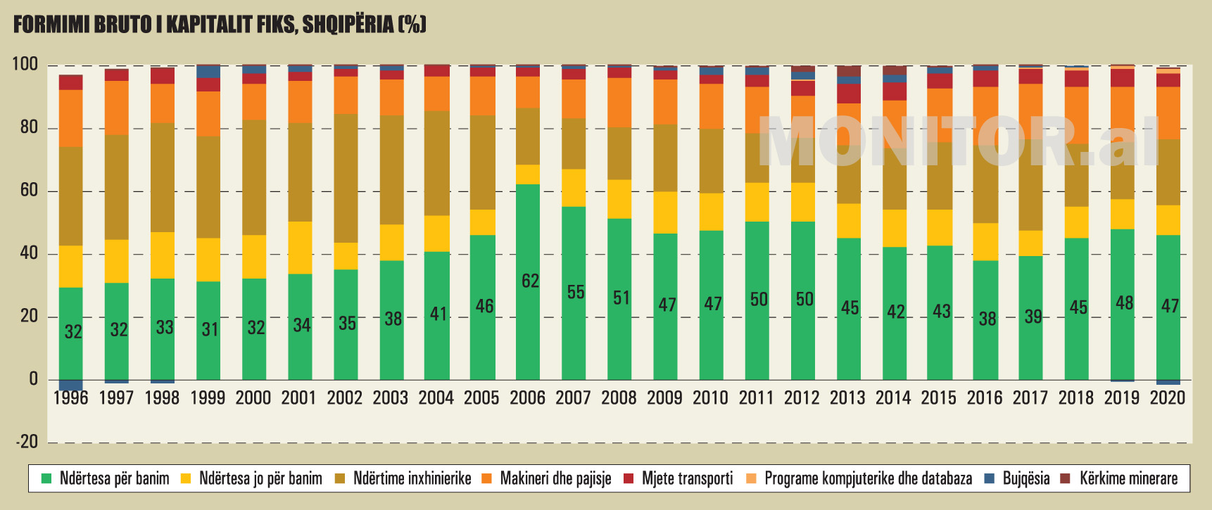 Gati 50% e investimeve totale të brendshme në vend, në vitin 2020, shkoi për banesa, nga 25% që është ky tregues për mesataren e Bashkimit Europian, sipas statistikave të tjera të Eurostat. Kjo peshë është më se dy herë më shumë sesa në shtetet e tjera të rajonit, që janë në faza të njëjta zhvillimi me ne.