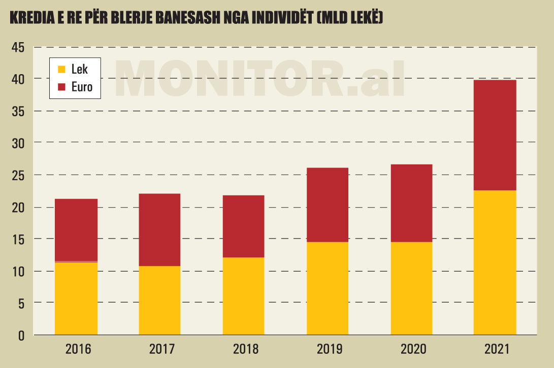 Kjo kategori është nxitur dhe nga shtimi i kredisë nga bankat. Të dhënat e Bankës së Shqipërisë tregojnë se huaja e re për blerje banesash u rrit me 50% me bazë vjetore në vitin 2021, duke arritur në rreth 320 milionë euro.