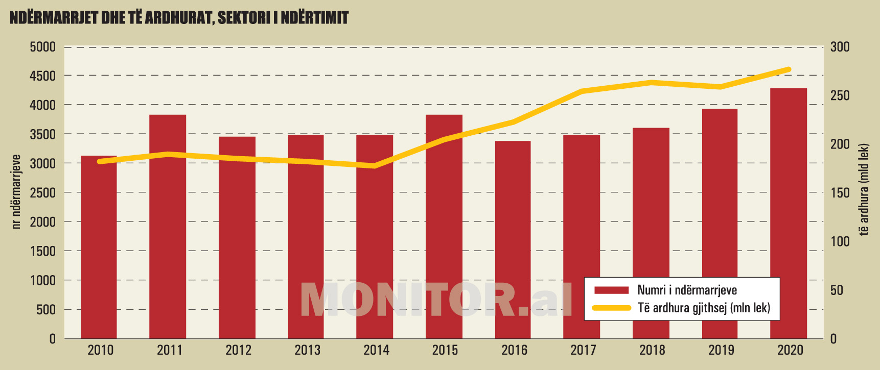 Në 2020-n, u shënua edhe një numër i lartë i hyrjeve të reja nga ky sektor, në renditjen e “Monitor 200”, për shkak të rritjes së shpejtë, ndërkohë që pjesa tjetër e ekonomisë ishte në stanjacion dhe tkurrje. Nga 200 më të mëdhenjtë, 33 prej tyre ishin në ndërtim, ose të lidhur me të, duke realizuar gati 1 miliard euro të ardhura.