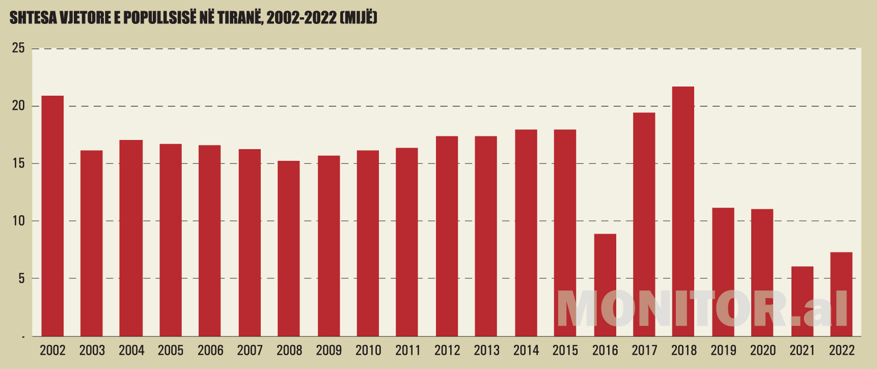 Sipas INSTAT, shtesa vjetore e popullsisë në kryeqytet, dy vitet e fundit, ka zbritur në 6-7 mijë persona në vit, nga 17 mijë në vit që ishte mesatarja vjetore në periudhën 2002-2018.