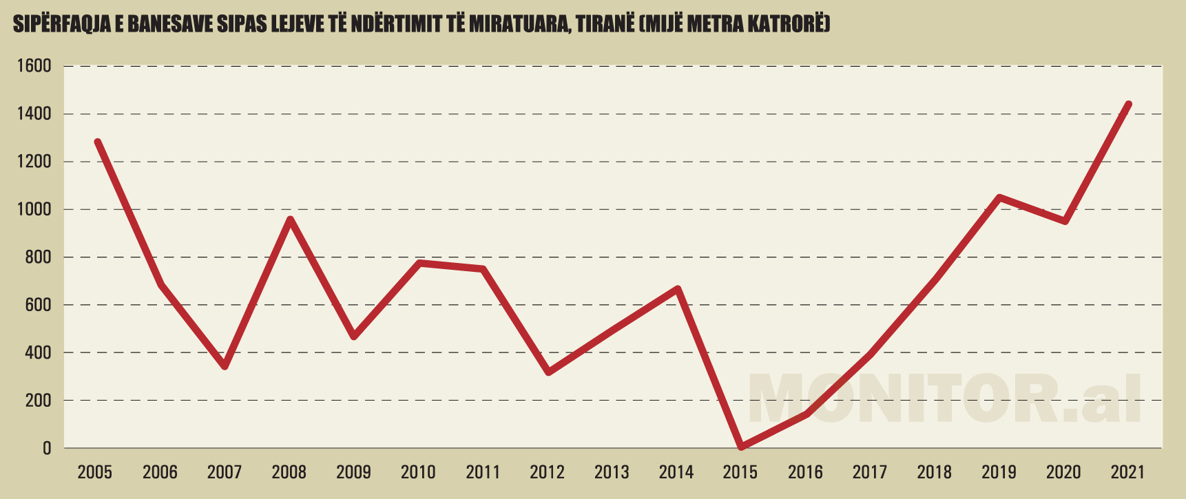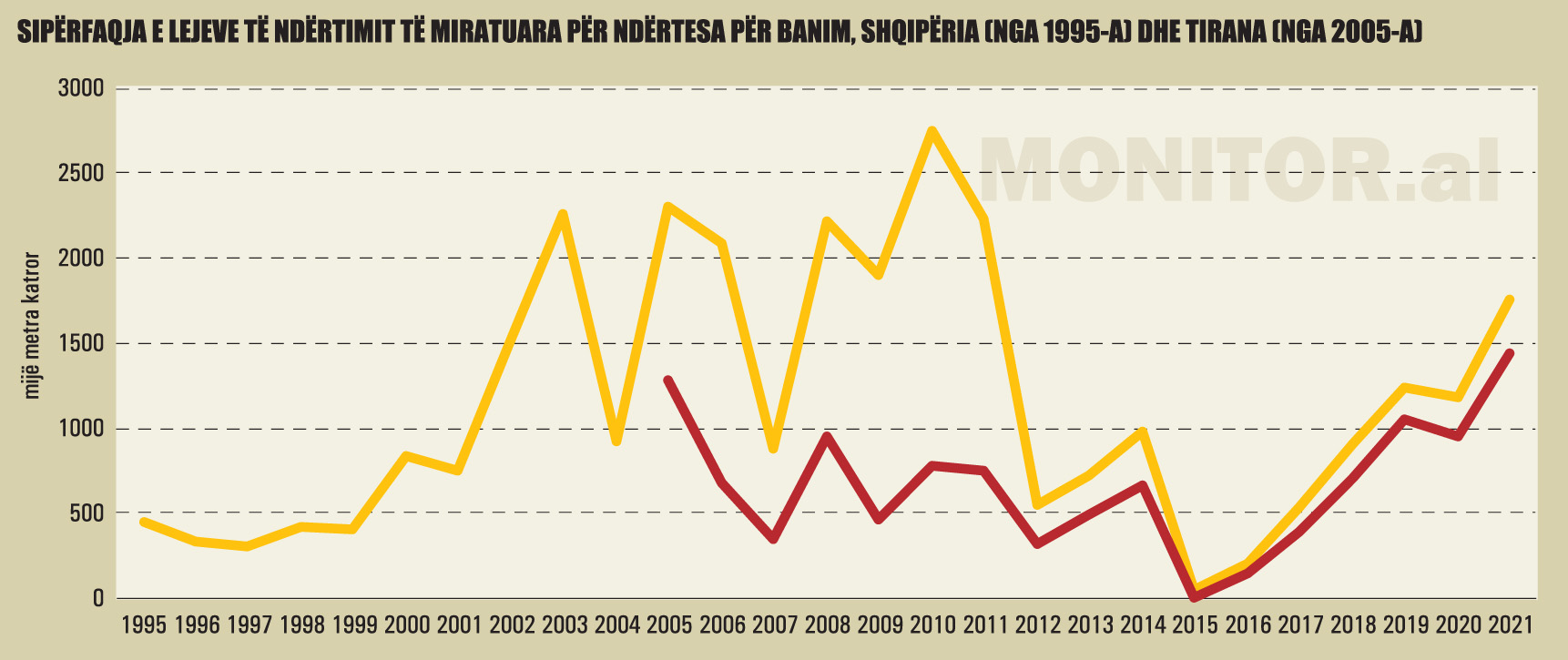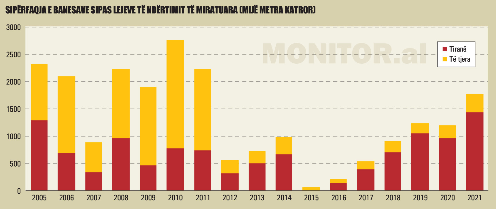 Vetëm në rang kombëtar, ato janë të disponueshme nga viti 1995. Por, të dhëna indirekte nga pesha që zënë lejet e kryeqytetit në total, sugjerojnë se në vitin 2021, në Tiranë, është dhënë sipërfaqja më e madhe e lejeve në historinë e tranzicionit të Shqipërisë, ndoshta me përjashtim të vitit 2003.