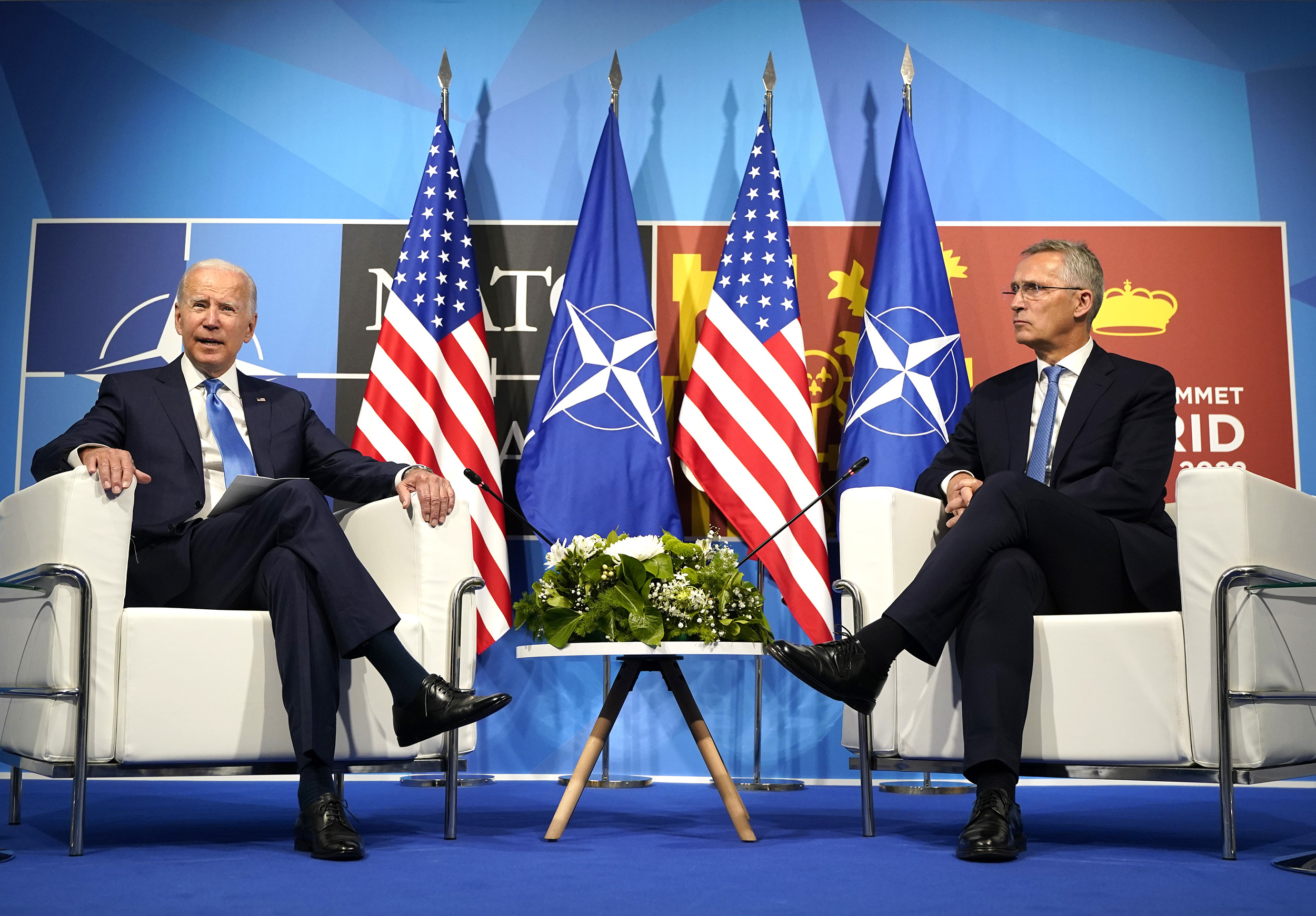 U.S. President Joe Biden, left, poses with NATO Secretary General Jens Stoltenberg during a meeting at the NATO summit in Madrid, Spain on Wednesday, June 29, 2022. North Atlantic Treaty Organization heads of state and government will meet for a NATO summit in Madrid from Tuesday through Thursday. (AP Photo/Susan Walsh)