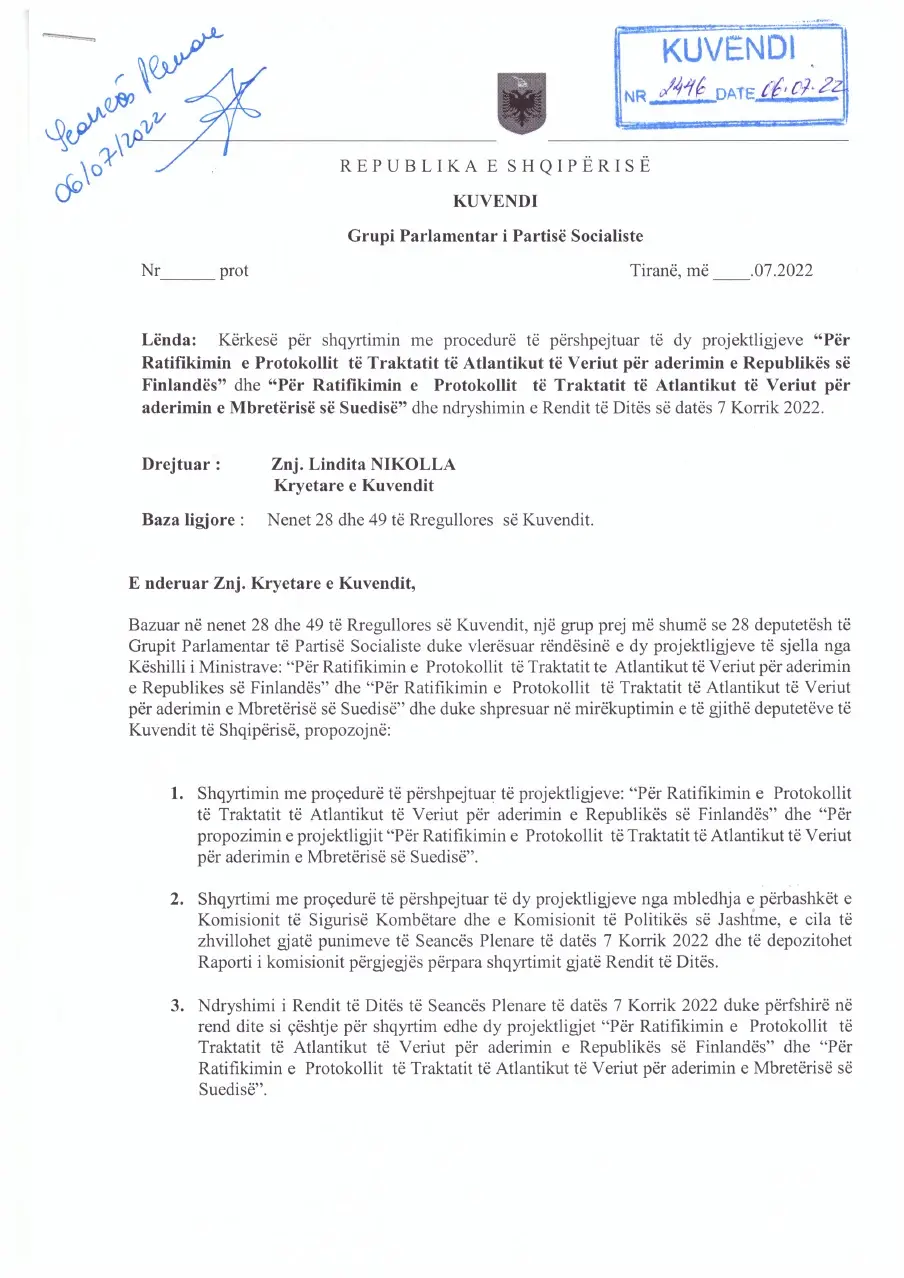 Kërkesë është depozituar nga kreu i grupit parlamentar të PS-së, Taulant Balla. Në këtë kërkesë kërkohet që këto protokolle të shqyrtohen në Komisionin e Jashtëm dhe në Komisionin e Sigurisë Kombëtare, ndërkohë që futen për votim në seancën e nesërme.