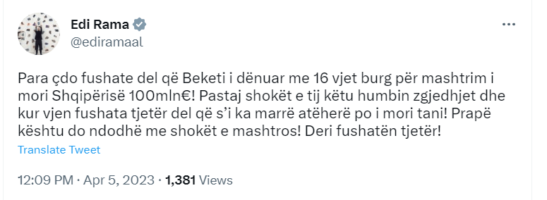 Ai shkruan në Twitter se çështja e Beketit del para çdo fushate zgjedhore i ka marrë 100 milionë euro Shqipërisë edhe pse rezulton i dënuar me 16 vite burg për mashtrim.