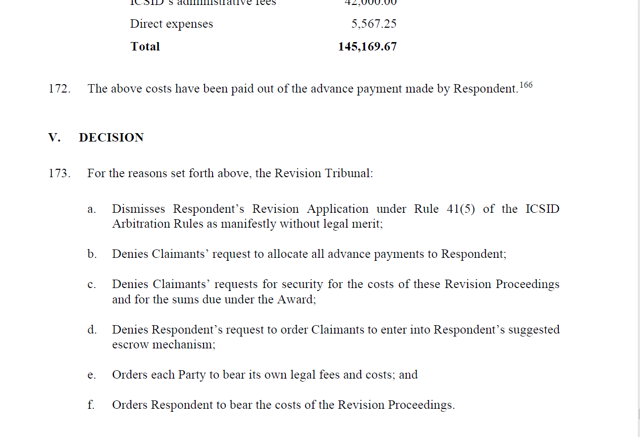 Vendimi është marrë më 29 mars, ndërsa trupa arbitrazhit përbëhej nga tre gjyqtarë, amerikane Grant Hanessian kryetar, Robert Anderson KC i Mbretërisë së Bashkuar dhe Charles Poncet i Zvicrës.