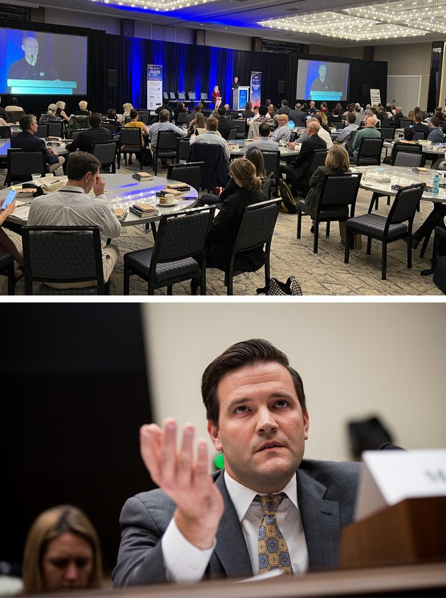Kur avokati Scott Lloyd (poshtë) doli në podium, publiku shpërtheu në duartrokitje. Njerëzit që u regjistruan për konferencën e çështjeve gjyqësore Covid në Atlanta (lart) paguan 600 dollarë për të dëgjuar nga panelistët, si Lloyd, i cili ka fituar famë për luftimin e institucioneve mjekësore