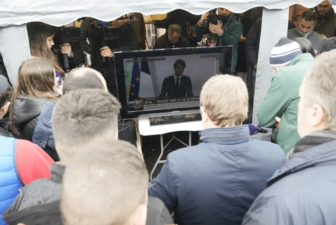 Fermerë në një autostradë të bllokuar shikojnë kryeministrin francez Gabriel Attal duke shpallur masat e reja për fermerët | Foto: Christophe Ena/© 2024 The AP.