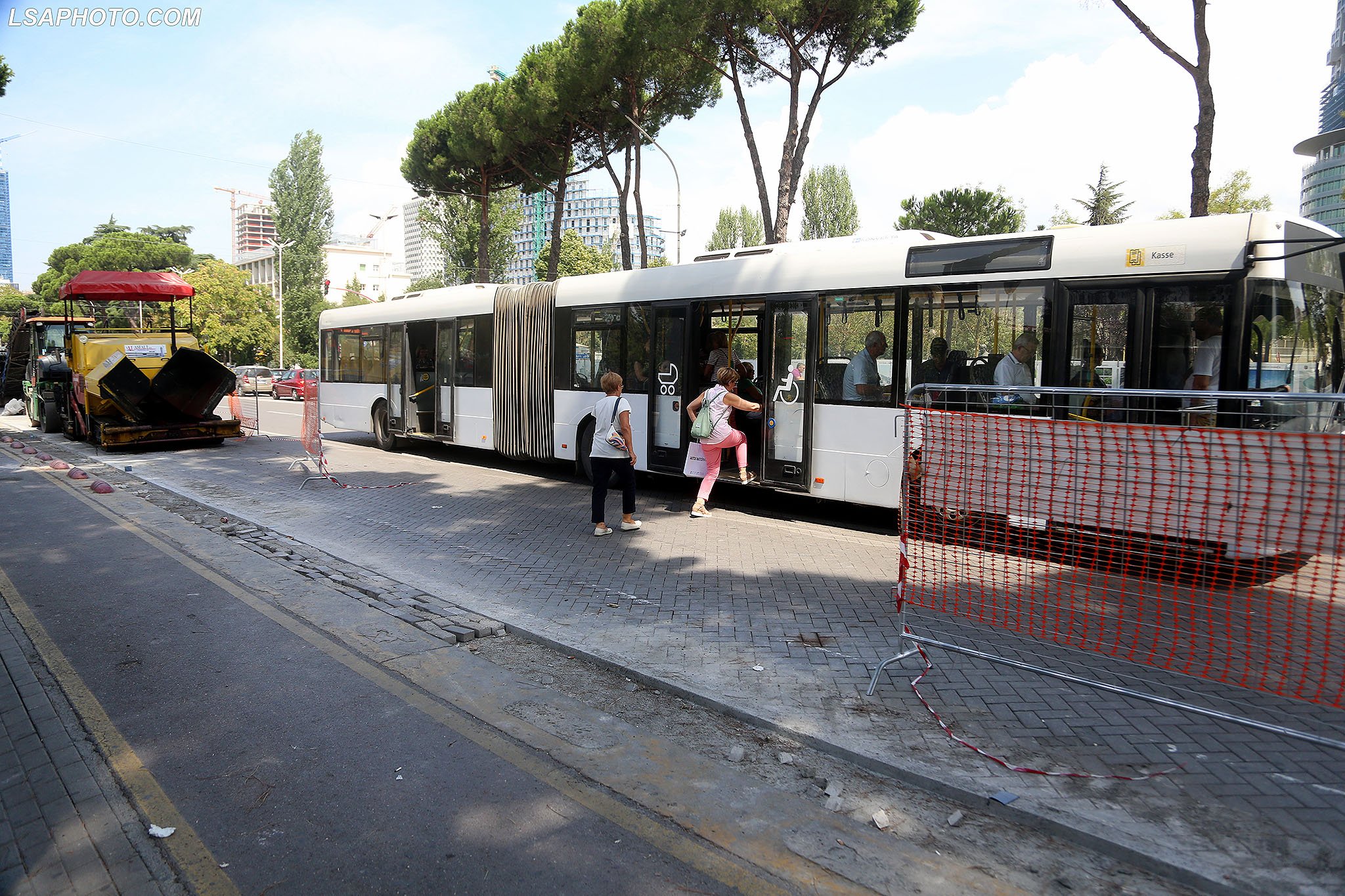 Qytetare duke hipur ne autobusin qytetas ndersa kryhen punime pergjate Bulevardit “Deshmoret e Kombit” ne Tirane, per te zgjeruar korsite e bicikletave. Punimet parashikojne zgjerimin e korsive, si vazhdimesi e fushates se Bashkise se Tiranes ne inkarujimin e perdorimit te bicikletave ne kryeqytet./r/n/r/nCitizens getting on the city bus while works are being carried out along the Boulevard “Deshmoret e Kombit” in Tirana, to widen the bicycle lanes.