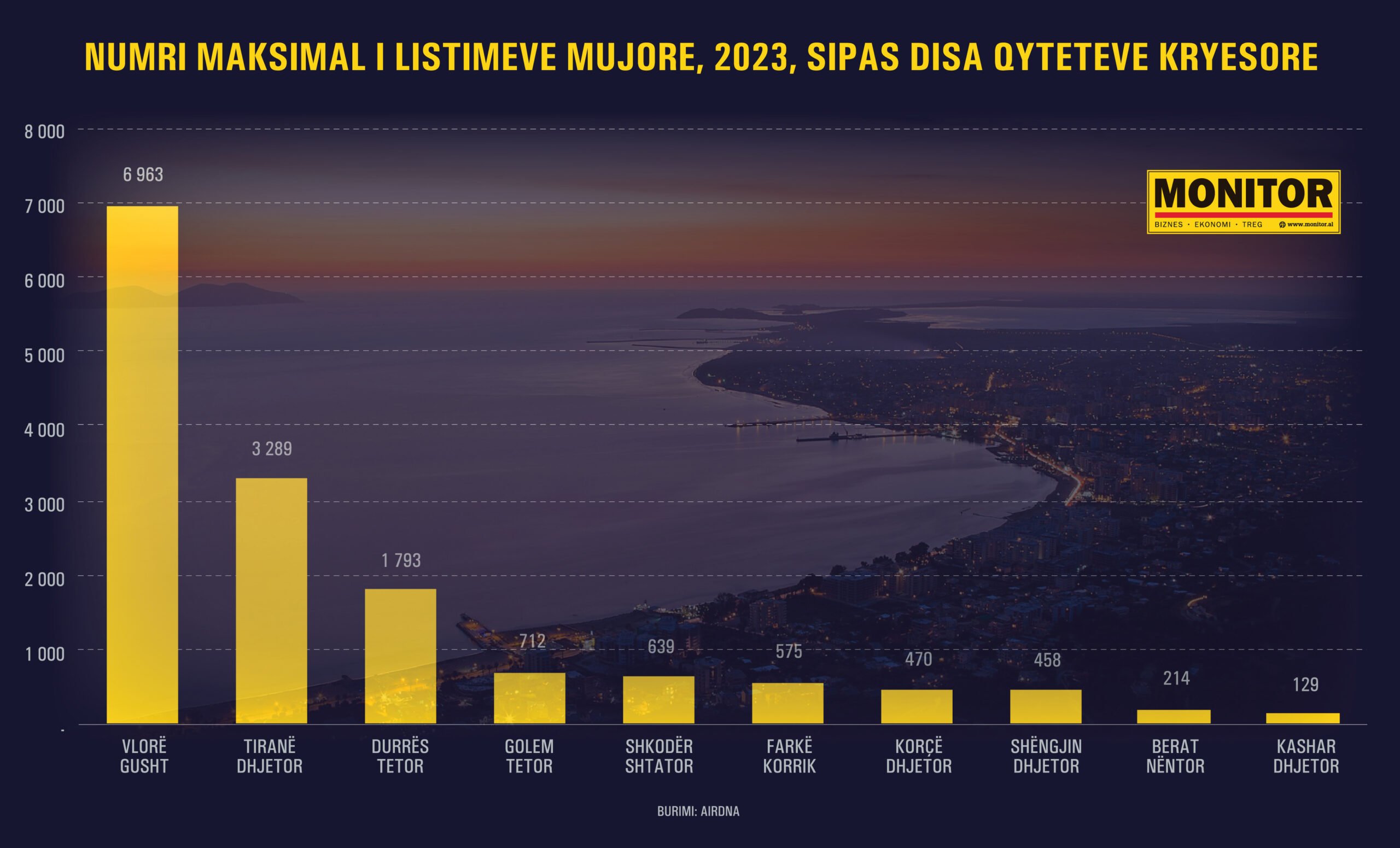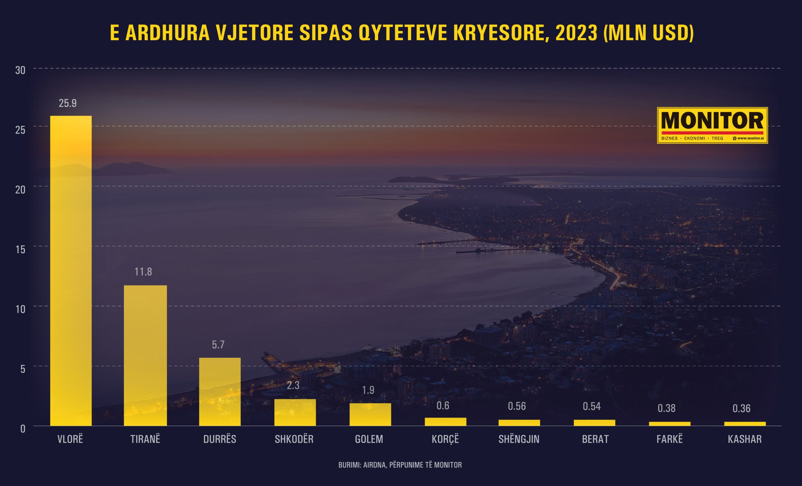 Vlora është qyteti që ka numrin më të lartë të njësive akomoduese të listuara, që arriti në gati 7 mijë/muaj në gusht dhe shtator. Treguesi REVPAR, i cili mat të ardhurën ditore neto (e llogaritur në bazë të çmimit ditor dhe normës së zënies së njësisë akomoduese) ishte 39 euro për gjithë vitin 2023, me një rritje prej 43% në krahasim me vitin e mëparshëm. Si rrjedhojë, e ardhura mesatare mujore për një njësi të dhënë me qira në Vlorë është 1163 euro.