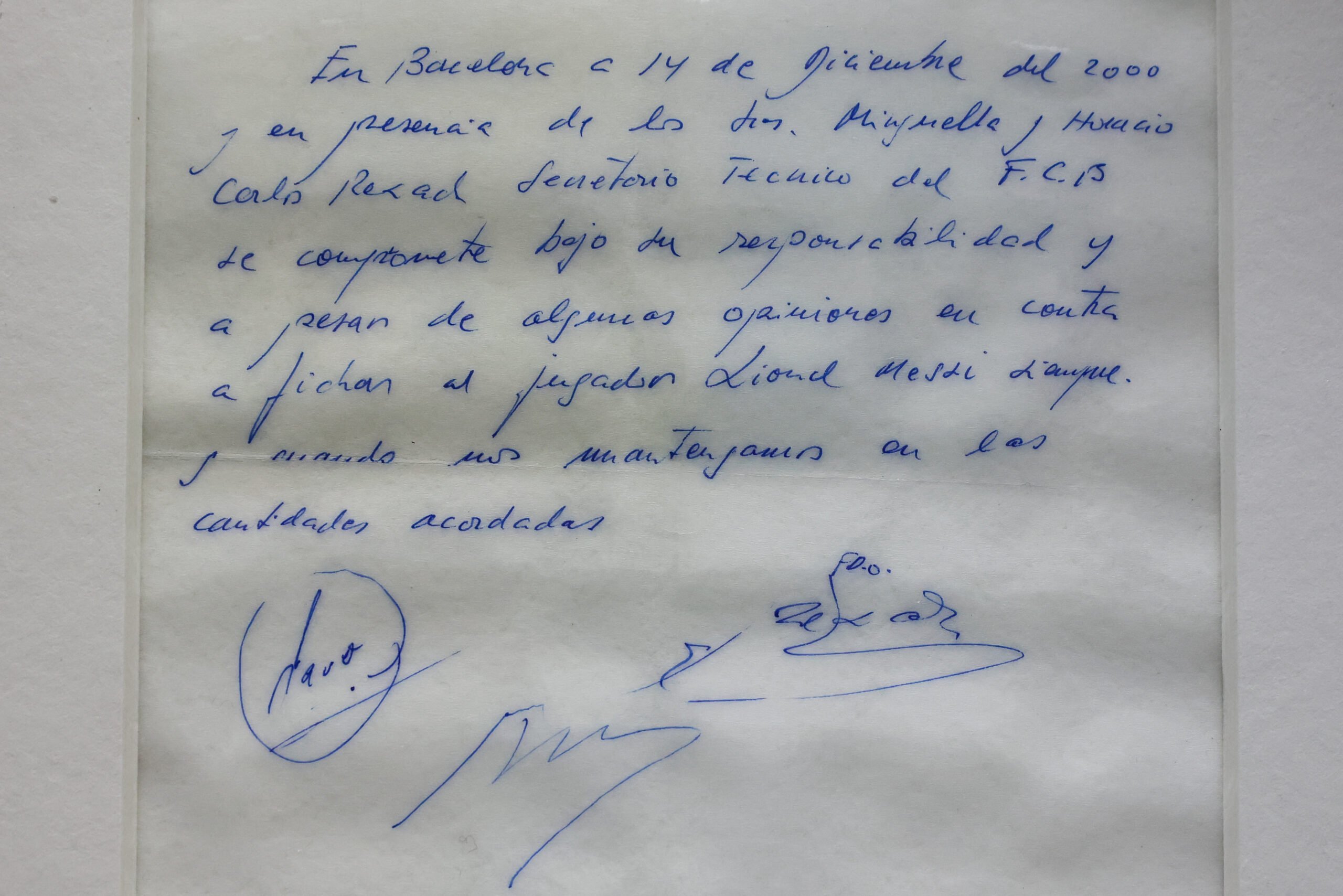 Kontrata e parë e yllit argjentinas me klubin spanjoll u nënshkrua me një pecetë standarde spanjolle në shtator 2000, kur ai ishte 13 vjeç.
