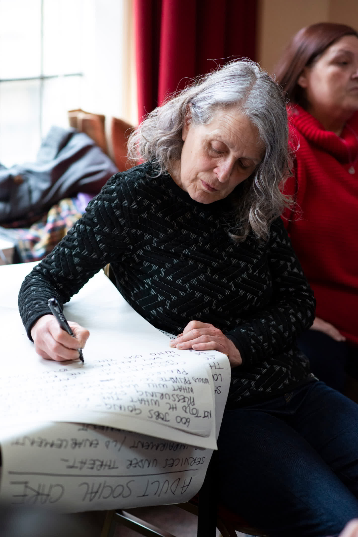 Një grua mban shënime gjatë një prej sesioneve të para pas takimit kryesor
