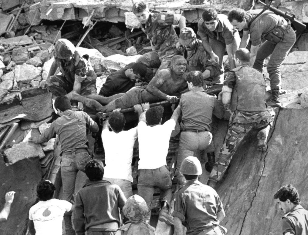 Ekipet e shpëtimit punojnë në vendin e një kazerme të marinës amerikane në Bejrut pas një shpërthimi atje që vrau 241 ushtarakë amerikanë në tetor 1983