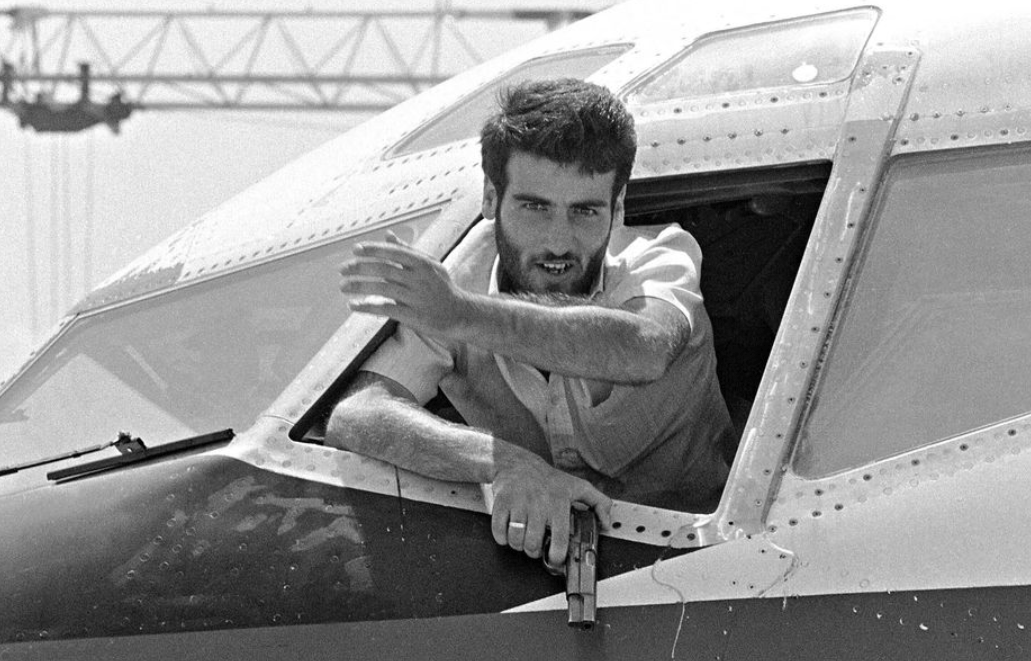 Një nga rrëmbyesit e fluturimit 847 TWA përkulet nga dritarja e kabinës në aeroportin e Bejrutit pasi avioni u mor peng në vitin 1985