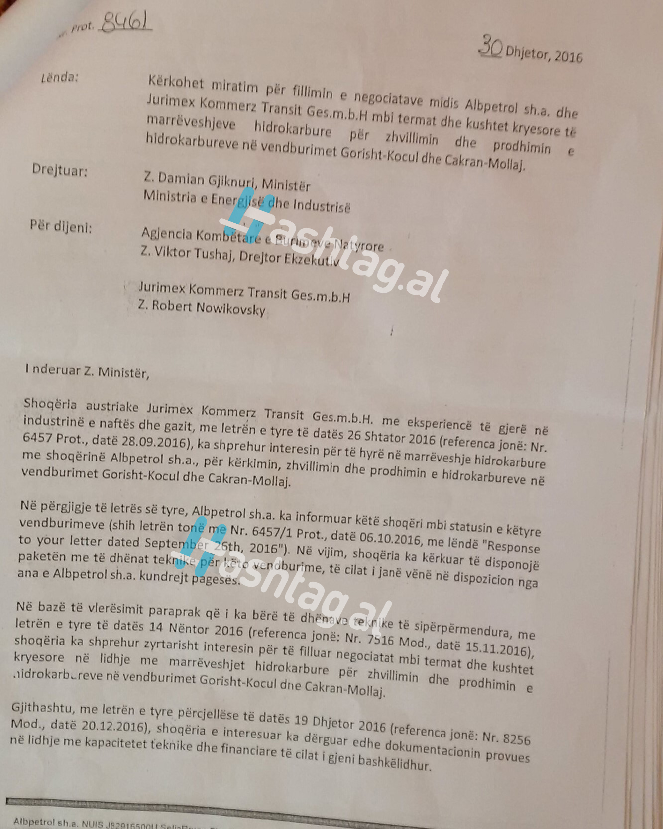 Pas një korrespondence disa mujore me rusët, drejtori i Albpetrol-it Endri Puka, në dhjetor 2016 i kërkoi ministrit Gjiknuri që të niste negociatat zyrtare me kompaninë JURIMEX për arritjen e një marrëveshje koncensionare.