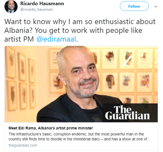 Javën e kaluar, makina e propagandës së qeverisë mori superxhiro: Një profesor i Harvardit shkruajti për “mrekullinë” ekonomike që po përjetonte Shqipëria. Siç kemi shpjeguar më parë, Ricardo Hausmann, Drejtori aktual i Qendrës për Zhvillim Ndërkombëtar (CID) pranë Shkollës së Qeverisjes Kenedi në Harvard, nuk ka arritur në këtë përfundim si pasojë e hulumtimeve të përpikta akademike—prej katër vjetësh ai është paguar në mënyrë të vazhdueshme për shërbime këshillimi për Kryeministrin Rama nga Fondacioni i Shoqërisë së Hapur, organizatë e lidhur ngushtë me qeverinë Rama. Shkrimi i një artikulli të tillë propagandistik është thjesht qershia mbi tortë e këtij shërbimi të paguar këshillimi.