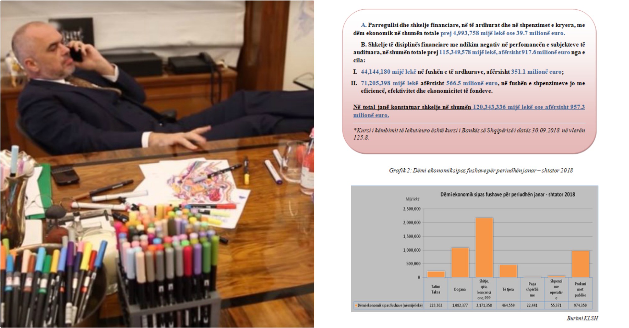 “ A. Parregullsi dhe shkelje financiare, në të ardhurat dhe në shpenzimet e kryera, me dëm ekonomik në shumën totale prej 4,993,758 mijë lekë ose 39.7 milionë euro.