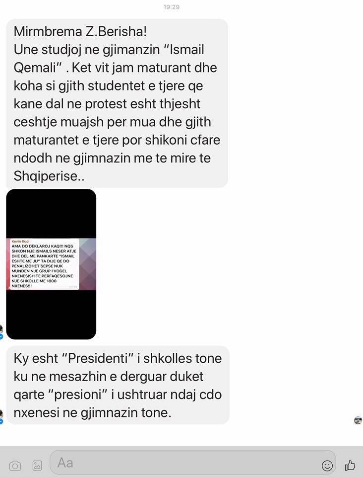 Në mesazhin e dërguar shihet qartë se si Presidenti i nxënësve të gjimnazit Ismail Qemali ushtron presion që bashkëmoshatarët e tij të mos i bashkohen protestës.