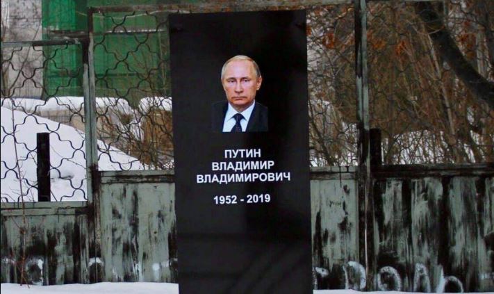 Në gurin e varrit të krijuar ishte vendosur fotografia e Putinit dhe vitet e jetës, 1952-2019.