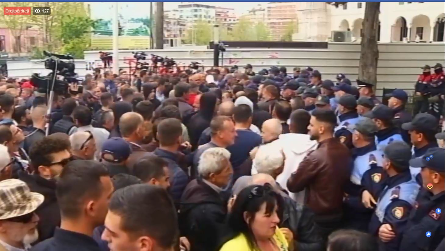 “Te nderuar qytetare . Ruani gjakftosine. Ruani qetesine. Mos hidhni kapsolla ne drejtim te punonjesve te policise. Mos u perplasni me punonjesit e policise. Te nderuar organizatore te protestes. Merrni masa te menjehereshme qe protestuesit qe kane mbuluar fytyren me shall e maska ose te zbulojne fytyren ose t’i largoni menjehere nga protesta. Sipas ligjit per tubimet mbulimi i fytyres denohet deri ne 6 muaj burg. Ju si organizatore te tubimit mbani pergjegjesi ligjore per mbarevajten e tubimit.”, bëjnë me thirrje policët.