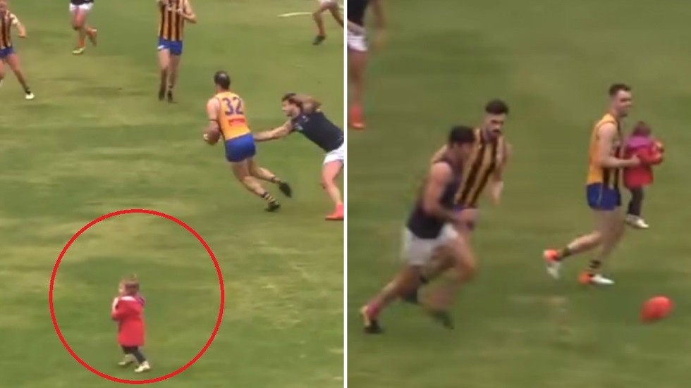 Një vajzë dyvjeçare u fut në fushë gjatë një loje futbolli në Australi, duke rrezikuar të lëndohej. Por fatmirësisht një prej lojtarëve e pa vogëlushen dhe e largoi atë.