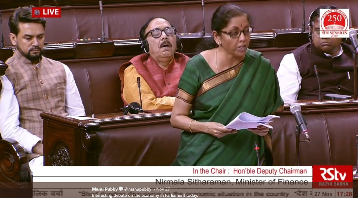 Ministrja e Financave, Nirmala Sithraman, po fliste në Kuvend duke diskutuar gjendjen e ekonomisë indiane.