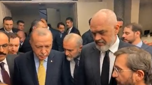 Në një moment kur Rama përshëndetet me Erdogan, presidenti turk siç shihet në videon e mëposhtme e ledhaton atë lehtësisht në faqe.
