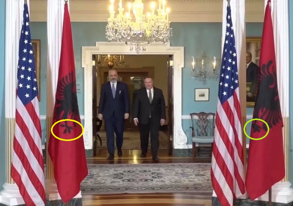 Kryeministri Edi Rama gjatë vizitës së tij në Uashington në takimin zyrtar me Sekretarin e Shtetit të SHBA-së Mike Pompeo shfaqet me dy flamurë shqiptarë të ndryshëm.
