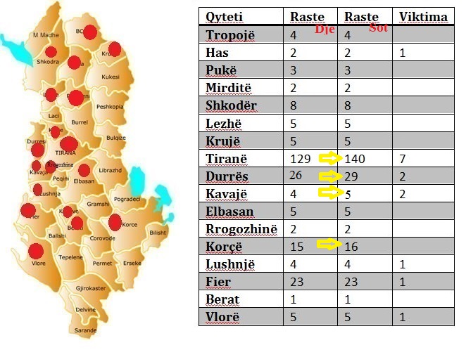 Regjistrohen 16 raste të reja me koronavirus në vend, duke e çuar numrin e të infektuarve në 259. Rastet e reja janë regjistruar në Tiranë (11), Durrës (3), Kavajë (1) dhe Korçë (1), siç shihen të paraqitura në hartën e shoqëruar me tabelën e mëposhtme.