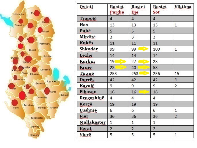 Ky është rezultati pas 252 testimeve që janë realizuar dje. Rastet e reja siç shihet edhe në hartën e ilustruar më poshtë janë në Krujë, Tiranë, Elbasan, Shkodër, Kurbin.
