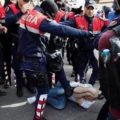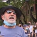 Një person i paidentifikuar është shoqëruar nga disa protestues të tjerë për ta nxjerrë atë jashtë tubimit dhe grumbullimit.