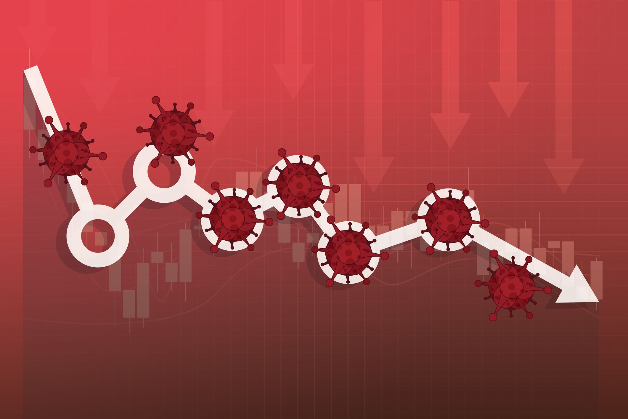 Stock Markets plunge from novel COVID-19 virus fear, world investment price fall down or collapse from outbreak of Coronavirus, stock market graph and chart equity price fall down from Virus pathogen impact.