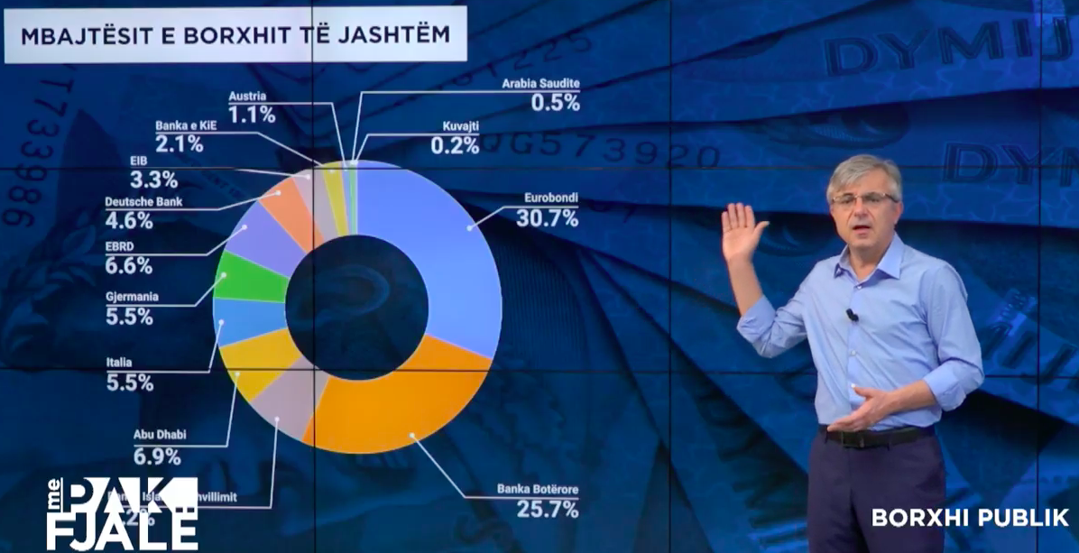 Ky borxh është i ndarë thuajse gjysëm për gjysëm mes borxhit ndaj huadhënesve vendas dhe atyre të huaj.