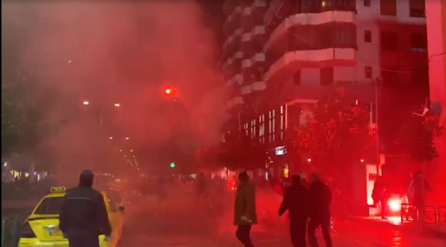 Tifozët kanë ndezur flakadanët. Tifozët kanë tentuar t’i venë flakën edhe një makine në atë zonë.