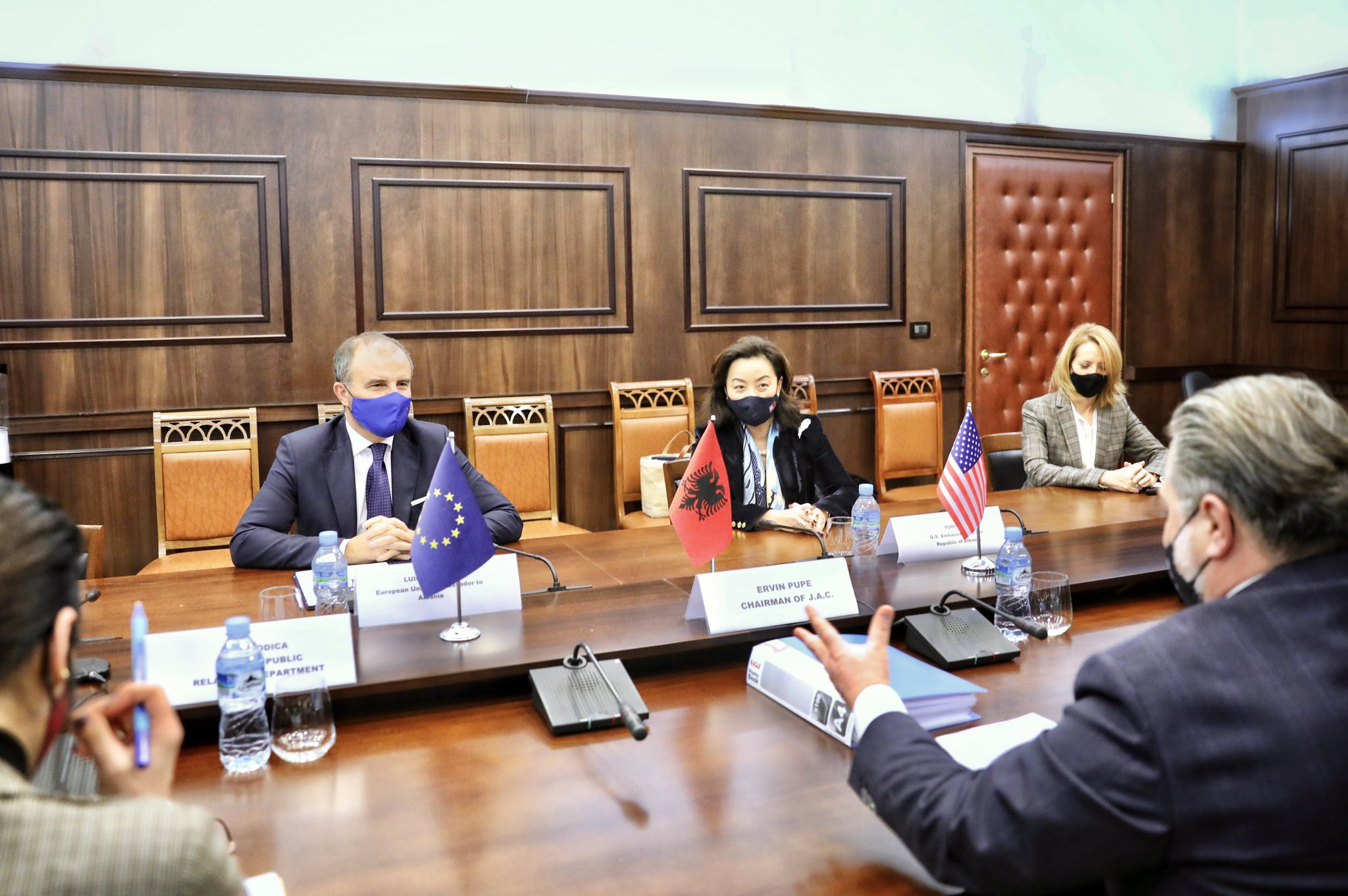 “Takova Kryetarin e Këshillit të ri të Emërimeve në Drejtësi, z. Ervin Pupe, së bashku me ambasadoren e SHBA në Shqipëri. Unë e përgëzova Këshillin e ri, i urova sukses në punën e tyre dhe konfirmova mbështetjen e fortë të BE-së, përfshirë edhe ndihmën tonë teknike. Është e rëndësishme që sapo Gjykata e Lartë të ketë hapur vakancat e mbetura për Gjykatën Kushtetuese, KED do të jetë gati të procedojë, në mënyrë që të sigurojë funksionalitetin e plotë të GJK sa më shpejt të jetë e mundur në muajt e ardhshëm”- shkruan Soreca.
