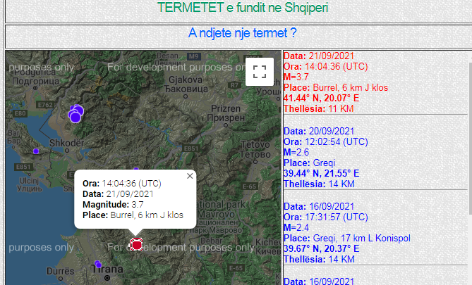 Ndërkohë sipas Institutit të Gjeoshkencave Ujit dhe Mjedisit në vendin tonë, tërmeti ishte me magnitutë 3.7 dhe me epiqendër në Klos, në Burrel.