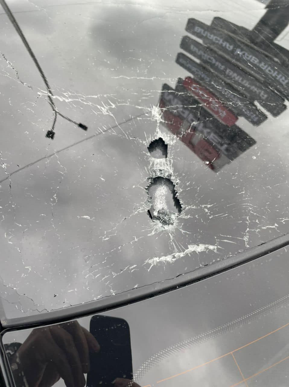 Një stacion televiziv lokal tha se të paktën 19 vrima plumbash mund të shiheshin në anën e shoferit të makinës.