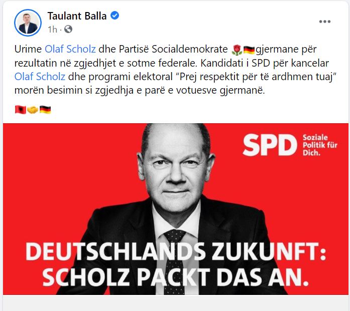“Urime Olaf Scholz dhe Partisë Socialdemokrate gjermane për rezultatin në zgjedhjet e sotme federale. Kandidati i SPD për kancelar Olaf Scholz dhe programi elektoral “Prej respektit për të ardhmen tuaj” morën besimin si zgjedhja e parë e votuesve gjermanë.” – shkruan Balla në Facebook.