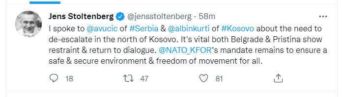 Mandati i KFOR -it mbetet të sigurojë një mjedis të sigurt dhe të mbrojtur dhe liri të lëvizjes për të gjithë”, shkruan Stoltenberg në Twitter.