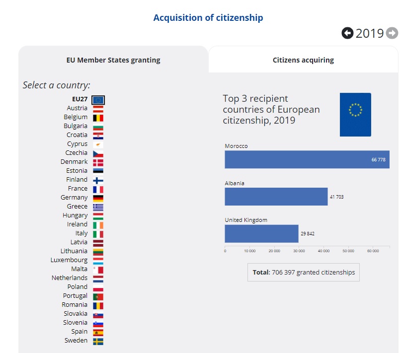 Ndërmjet periudhës 2014 deri në 2019, numri i shtetësive të dhëna nga një shtet anëtar i BE-së ka ndryshuar nga 672 000 në 2018 dhe 844 000 në 2016. Në vitin 2019 u dhanë 706 000 shtetësi nga vendet BE-së. Marokenët përfituan 9 % te të gjitha shtetësive të dhëna, shqiptarët 6% të totalit dhe qytetarët britanikë, 4% të totalit.
