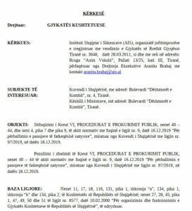 Organizata AIS e njohur si Open Data Albania ka depozituar në Gjykatën Kushtetuese një Kërkesë për Shfuqizim të pjesshëm të Aktit Normativ me fuqinë e Ligjit Akt nr. 9, datë 16.12.2019 titull “Për përballimin e pasojave të fatkeqësisë natyrore”, miratuar nga Kuvendi i Shqipërisë me ligjin nr. 97/2019, në datën 18.12.2019, konkretisht shfuqizim të Kreut VI, Procedurat e Prokurimit Publik, nenet 40 – 44, dhe neni 4, pika 7 dhe pika 9.