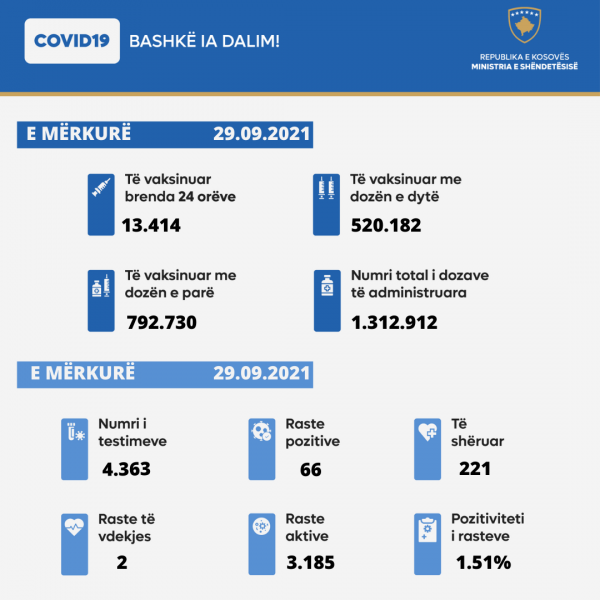 “Në 24 orët e fundit janë dhënë 13.414 doza të vaksinës kundër COVID-19. Prej fillimit të vaksinimit në të gjitha qytetet e Kosovës janë dhënë 1.312.912 doza të vaksinës. Deri më sot 520.182 qytetarë janë vaksinuar me dozën e dytë.”– bëhet me dije nga Ministria e Shëndetësisë.