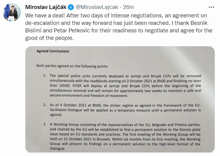 “Ne kemi arritur një marrëveshje. Pas dy ditëve negociatash intensive, është arritur marrëveshja për qetësimin e situatës. Dua të falënderoj Besnik Bislimin e Petar Petkoviçin për gatishmërinë për të negociuar dhe për t’u pajtuar për të mirën e njerëzve.” – ka shkruar Lajçak në Twitter.