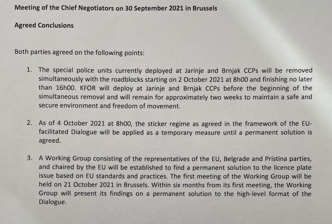 Sipas marrëveshjes të arritur sot në Bruksel me ndërmjetësimin e BE-së, forcat e njësisë speciale të Policisë së Kosovës të vendosura në Jarinjë e Bërnjak, do të largohen njëkohësisht me bllokadat në rrugë më 2 tetor në orën 8 të mengjesit 8:00 dhe gjithë kjo tërheqje do të përfundojë maksimalisht deri në orën 16:00.