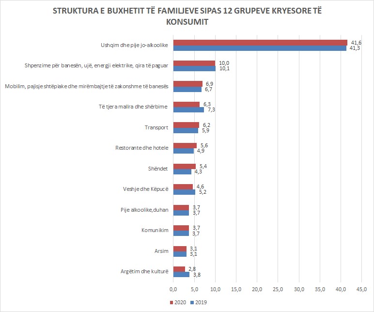 Vlerësimi i shpenzimeve mesatare mujore për konsum të NjEF-ve në vitin 2020, është 1,5 % më i lartë se në vitin 2019. Rritja e çmimeve të konsumit, në vitin 2020, krahasuar me vitin 2019, është 1,6 %. Uljen më të madhe të shpenzimeve mesatare për konsum mujor, në vitin 2020, e ka shënuar grupi “Argëtim dhe kulturë” me 26,4 %, krahasuar me vitin 2019, ndërsa rritja më e madhe është shënuar në grupin “Shëndet” me 28,0 %.