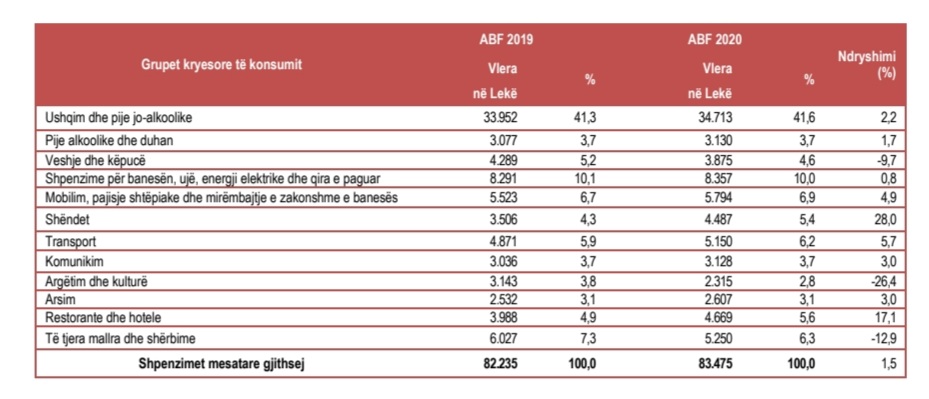 Sipas Anketës së Buxhetit të Familjeve të INSTAT, Në vitin 2020, shpenzimet mesatare mujore për konsum për një NjEF, të përbërë mesatarisht nga 3,6 persona, janë 83.475 lekë. Totali i shpenzimeve për konsum është 64,2 miliardë lekë në muaj për 768.963 familje.